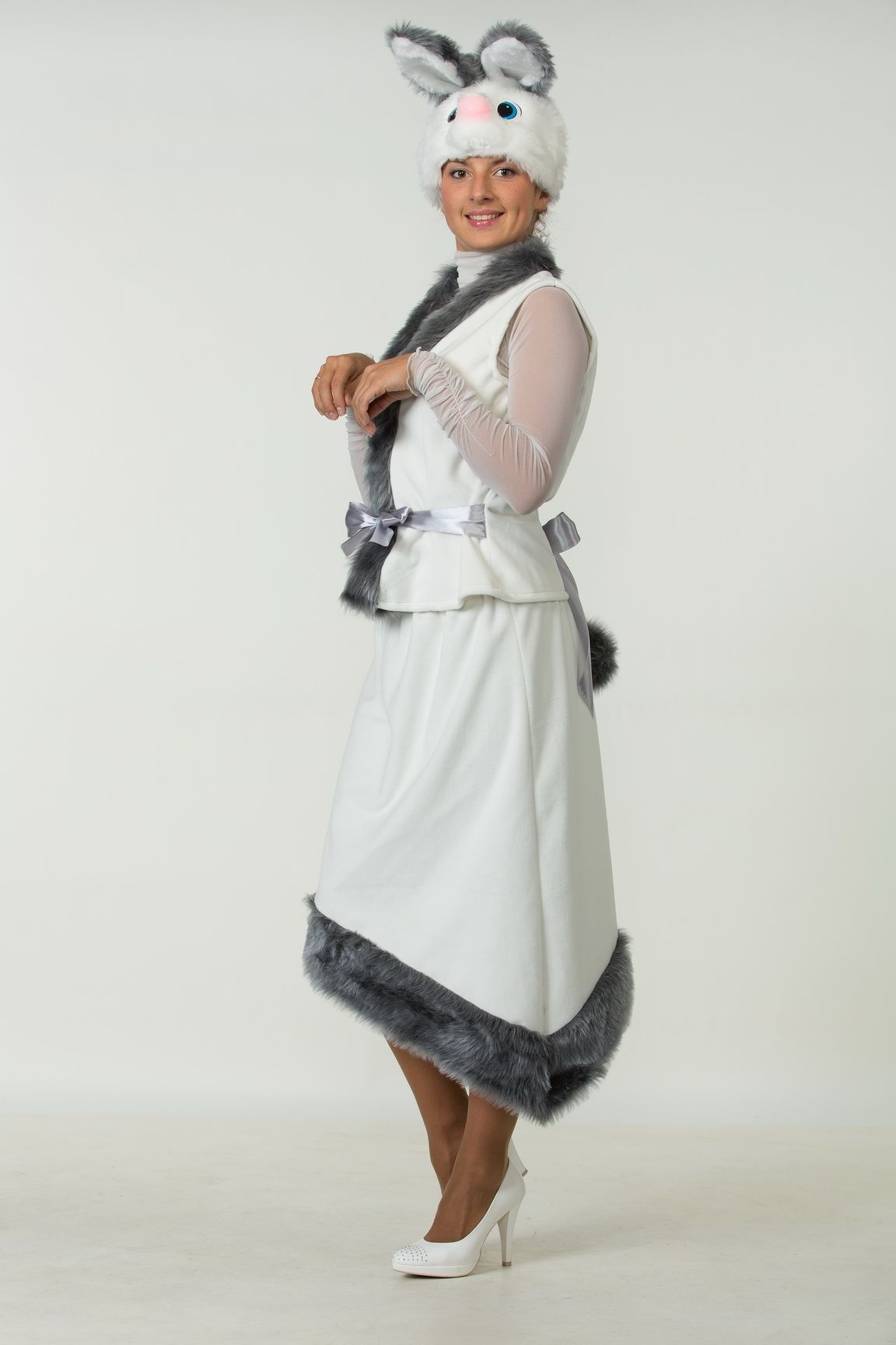 Плюшевый костюм Белой Зайки прекрасное решение для Новогодних праздников и выступлений. Костюм включает в себя длинную белую юбку с косым подолом серого цвета, сзади к юбке прикреплен серый маленький хвостик. Также имеется белый жакет с поясом и серой отделкой и шапочка-маска с мордочкой зайчика и длинными ушками.