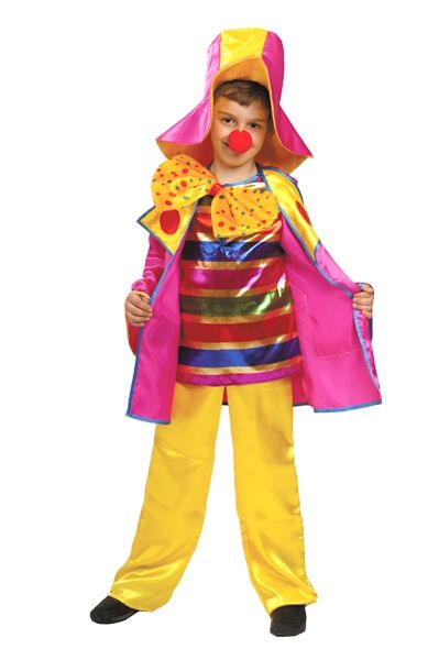 В комплект карнавального костюма клоуна Кости входит пиджак, брюки, нос и шляпа.
