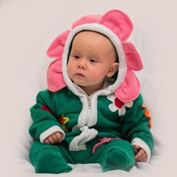 Костюм для малышей Цветочек представляет собой флисовый мягкий комбинезон, выполненный в зеленом цвете, украшенный цветочками, а также капюшоном с розовыми лепесточками.