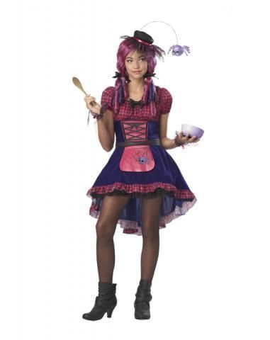 Симпатичный костюм ведьмочки подростковый станет отличным нарядом для Хэллоуина и Пятницы 13. Яркое платье в клеточку с сиреневым подолом и маленьким фартучком с изображением паука в паутине, а также шляпка с прикрепленным пауком не оставляет сомнений, что на своей кухне вы готовите приворотные зелья и совершаете другие маленькие шалости, а пауки вам в этом помогают.