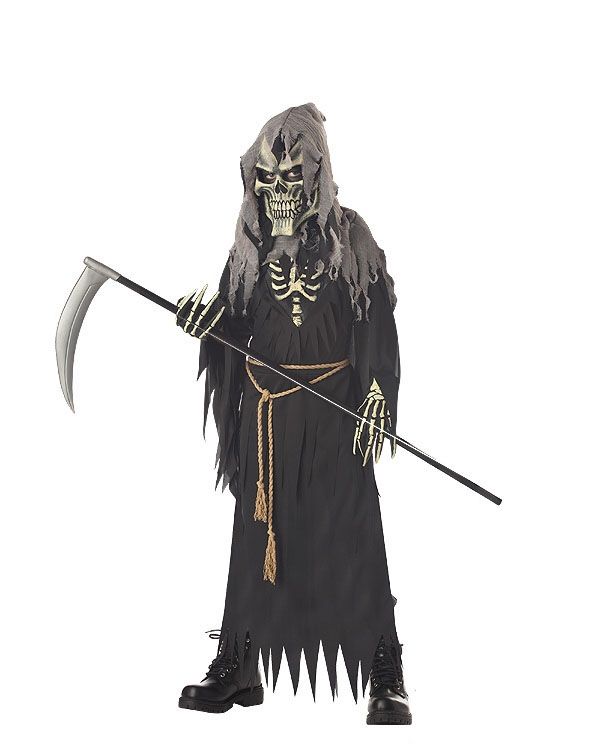 Костюм темного вестника смерти включает в себя черную мантию с изображением грудной клетки, капюшон из рваной мешковины, характерную жуткую маску, также имеются перчатки в виде скелетных рук и коричневый шнурок-пояс. Коса в комплект не входит, но ее можно приобрести отдельно у нас, а также другие жуткие аксессуары. Такой костюм может стать одним из самых ужасных в хорошем смысле на вечеринке в честь Хэллоуина.