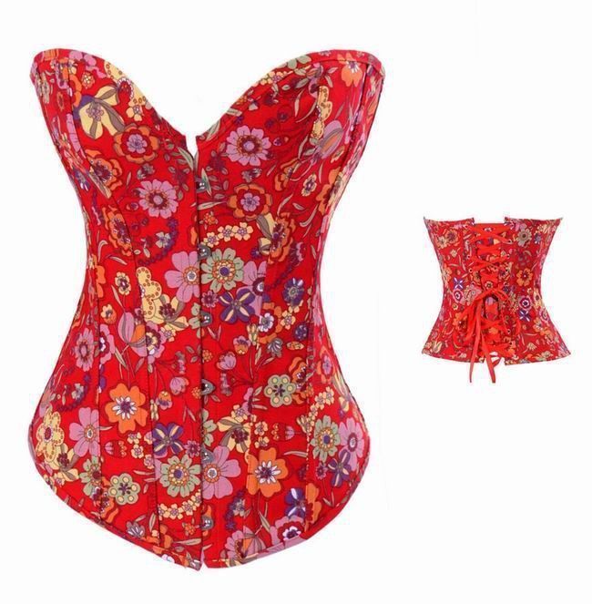 Миловидный, приятный для глаз и на ощупь корсет цветочной окраски без бретелек, с застежками спереди и шнуровкой сзади.