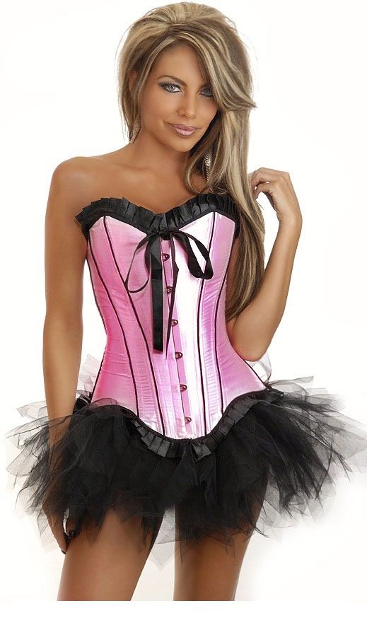 Розовый корсет на застежка спереди с черной юбкой. Корсет декорирован черными атласными лентами. В комплект входят стринги.