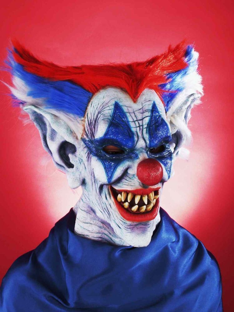 Маска жуткого цветного клоуна - это латексная маска зловещего клоуна с кривыми зубами и красным носом. Множество морщин, длинные уши и разноцветные острые волосы - весьма пугающее зрелище. В маске имеются отверстия для глаз.