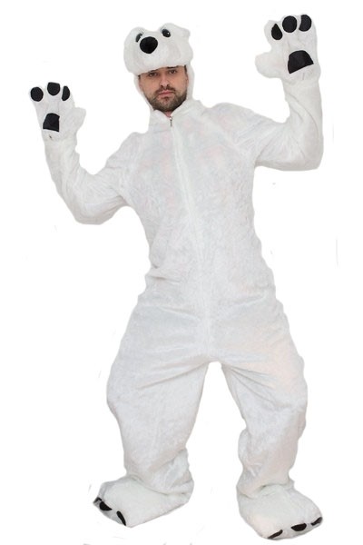 Костюм белого медведя - меховой белый костюм для взрослых, который включает в себя мягкий комбинезон с лапами. Комбинезон на молнии. Также в комплект входит маска-шапочка в виде мордочки медведя.
