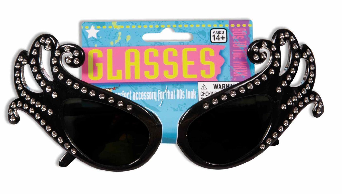 Очки 80-х со стразами идеально подойдут к костюмам 80-х годов. Очки выполнены в чёрном цвете, на линзах имеются завитушки на которых изящно расположены стразы.