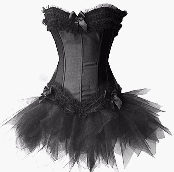 Превосходный черный корсет с пышной юбкой, декорированный бантами и кружевами.