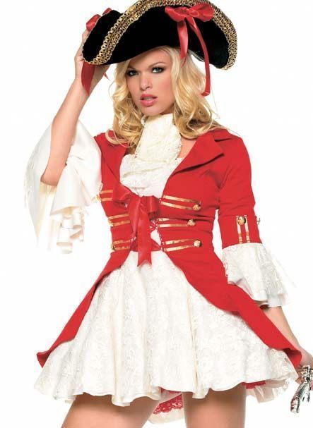 Женский костюм пиратского капитана включает в себя мни-платье белого цвета, красный пиджак и ажурное жабо. К этому костюму вы можете подобрать шляпу, чулки, оружие и прочие дополнительные вещи.