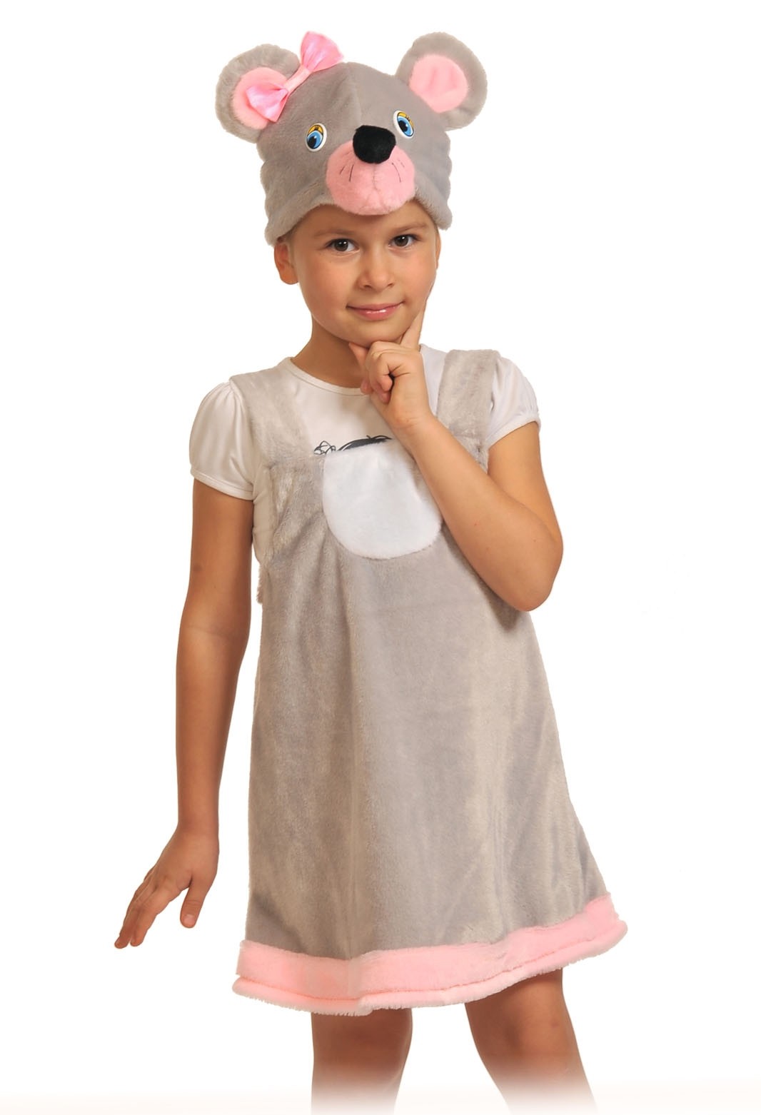 Костюм плюшевой мышки выполнен из мягкого плюшевого материала серого цвета. В комплект костюма входит платье с белым кармашком на груди и розовой отделкой, а также шапочка-маска в виде мордочки мышки с ушками и розовым бантиком.