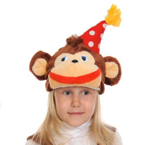 Плюшевая маска Мартышка в колпаке выполнена из мягкого материала в коричневых цветах. Маска-шапочка выполнена в виде мордочки мартышки в ярком красном колпаке в белый горох.