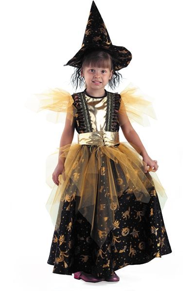 Карнавальный костюм "Золотая ведьмочка" отлично подойдет для девочек, которые не боятся погрузится в мир удивительной сказки, созерцать волшебство и творить его своими руками. В костюм входит платье черно-золотого цвета, а также шляпа ведьмы с волосами.
