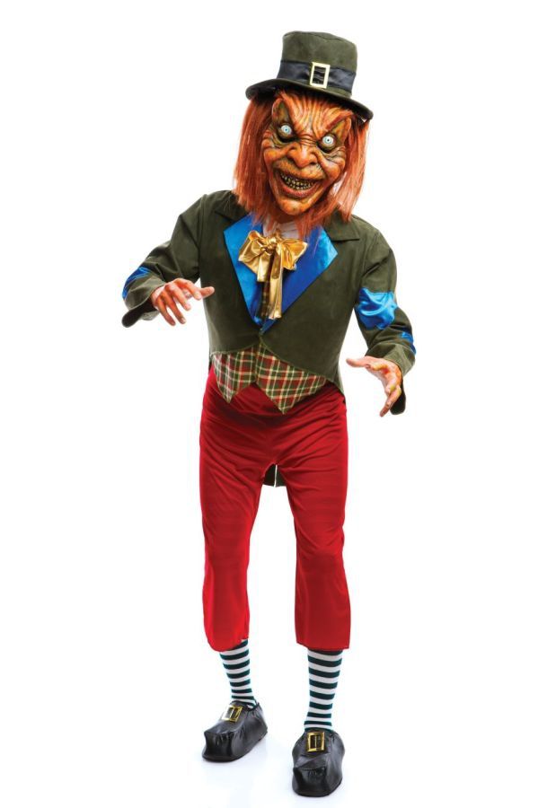 Костюм жуткого лепрекона включает в себя курточку с жилетом, красные брюки, полосатые носки, обувь, а также латексную маску со шляпой. Костюм этого сказочного персонажа можно приобрести для Новогодних праздников, Хэллоуина, Пятницы 13 и подобных праздников.