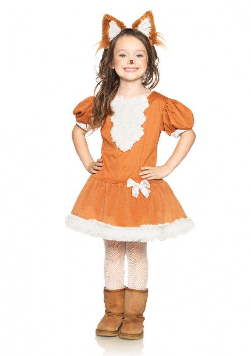 Костюм дружелюбной лисы детский включает в себя коричневое платье с белым подолом, грудкой и бантиком сбоку. Сзади к платью прикреплен пышный хвост. Также в комплект входят коричнево-белые ушки.
