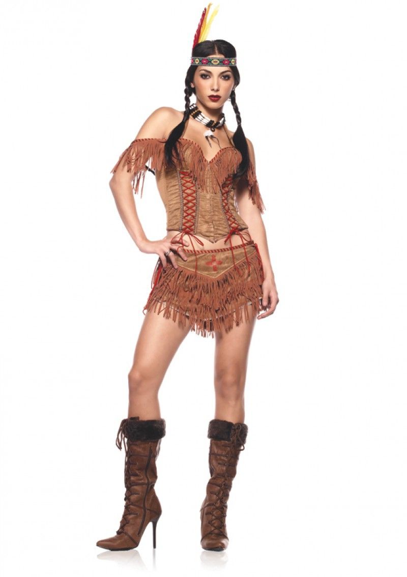 Костюм принцессы индейцев выполнен в коричневом цвете из искусственного замшевого материала. В комплект костюма входит топ на косточках, спереди имеется декоративная красная шнуровка, также имеется короткая юбочка с бахромой и головной убор с перьями.
