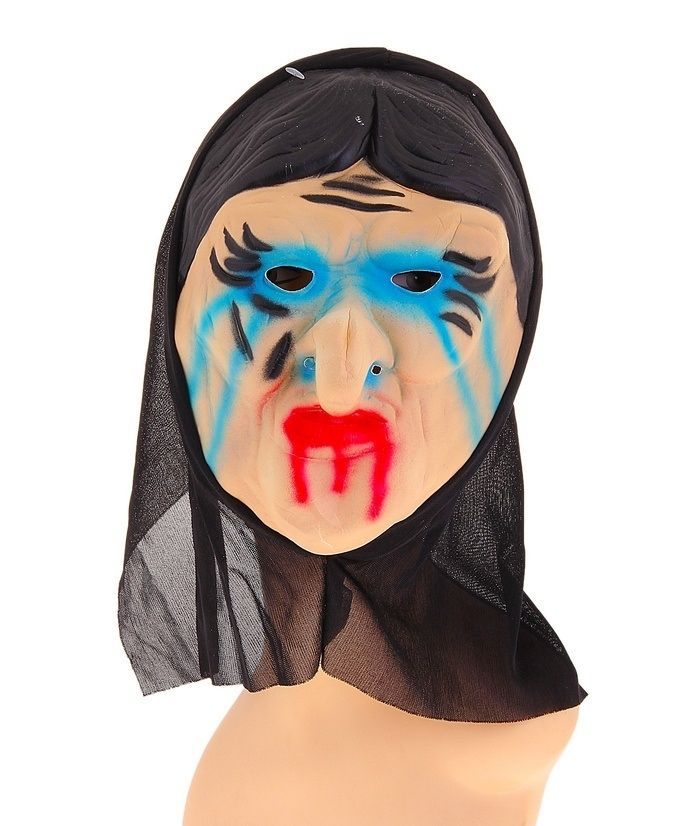 Маска Бабки ежки в черной накидке, с безобразным носом и красными губами с подтеками крови. Такая старуха не прочь полакомиться беспечными грибниками, которые забрели в глухую чащу, потерялись и набрели на избушку на курьих ножках.