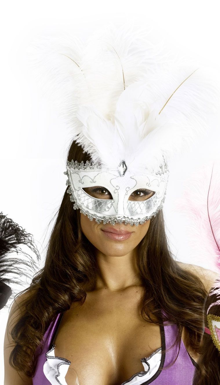 Карнавальная маска серебряная - это блестящая маска на глаза, которая украшена серебряной тесьмой и закругленными узорами. К верхней части маски прикреплены белые пушистые перья различного размера.