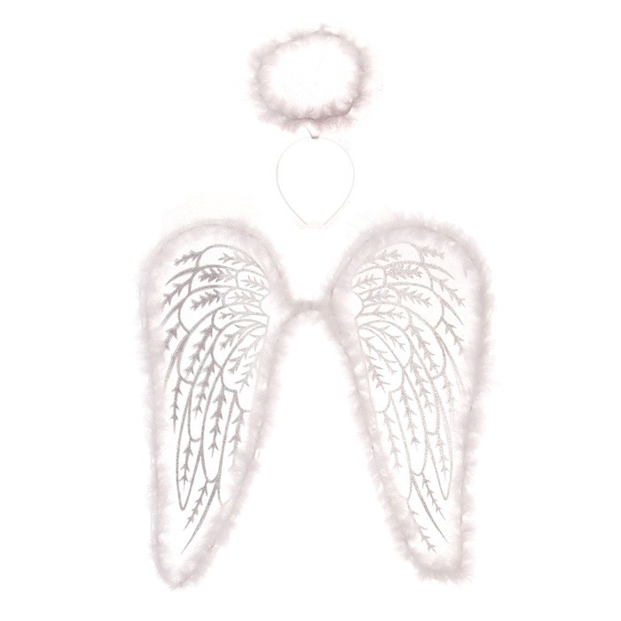 Нимб и крылья ангела - отличный аксессуар для костюмов светлых ангелов. Нежные легкие крылья украшены белым пухом и узором из блесток в виде перьев. Пушистый нимб прикреплен к удобному белому ободку.