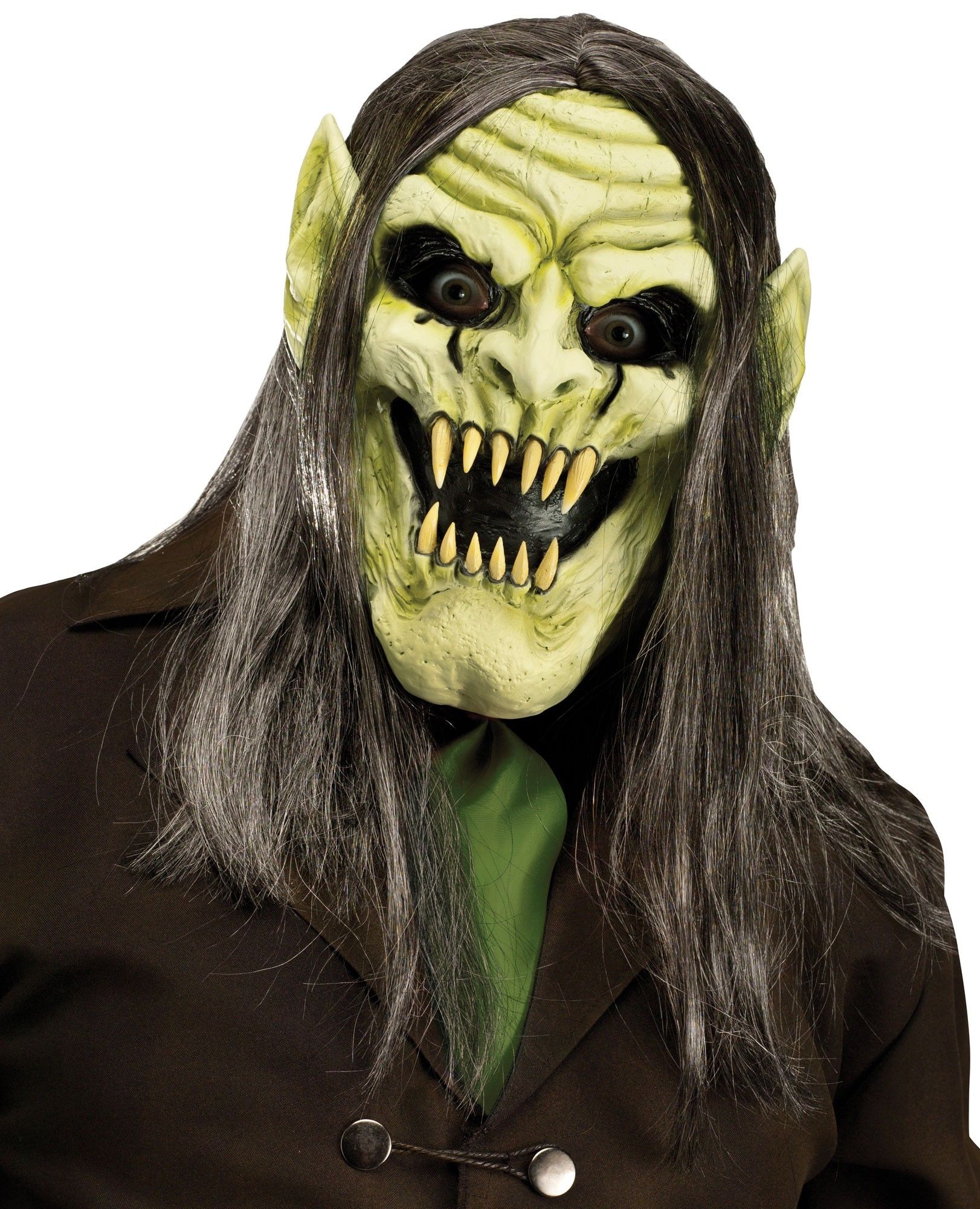 Маска демонического вампира зеленая выполнена в кислотно-зеленом цвете, что придает больше жути в образ. В маске имеются сквозные прорези для глаз. Пугающие желтые длинные клыки и острые торчащие уши выглядять очень ужасно и пугающе. К маске прикреплены длинные редкие волосы серого цвета.