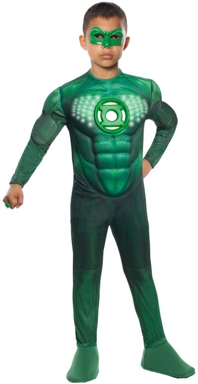 Детский костюм Хэла Джордана - одного из супергероев вселенной DC Comics - включает в себя зеленый комбинезон с рельефными накладными мышцами и светящимся логотипом, зеленое кольцо и зеленую маску на глаза.