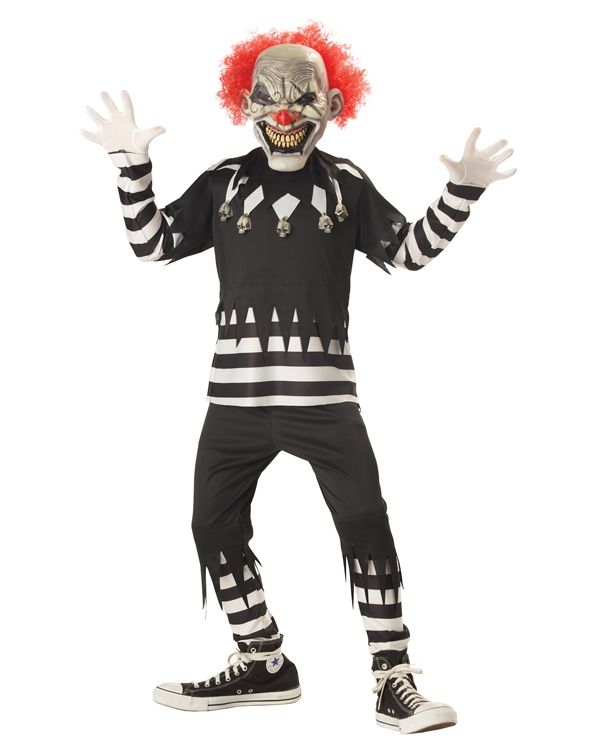 Детский костюм жуткого клоуна - это жуткий костюм, который станет идеальным нарядом для Хэллоуина и подобных праздников. Костюм выполнен в черно-белом цвете. В костюм входит кофта с воротником, к которому прикреплены черепа, брюки, а также маска с жуткой мордой клоуна, к маске прикреплены красные волосы и она светится в темноте, что придаст костюму более жуткий образ.