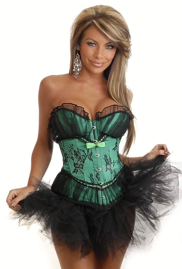Необыкновенного цвета корсет с юбкой - зеленая долина декорирован снизу и сверху черной прозрачной тканью. В этом корсете вы будете само очарование. Корсет на застежках спереди и шнуровке сзади. В комплекте идут стринги.