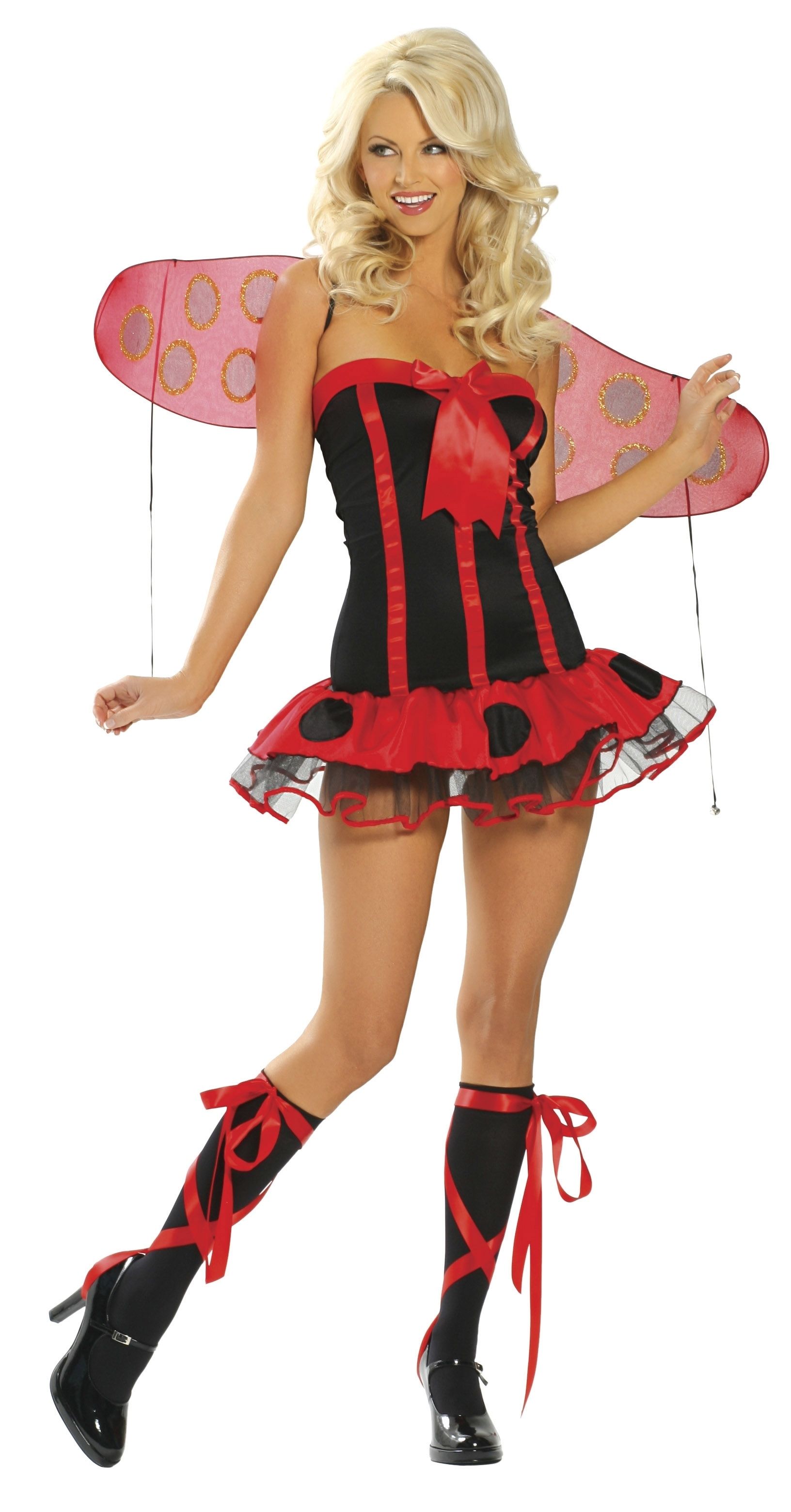Костюм сексуальной божьей коровки включает в себя мини платье с встроенным подъюбников, наголовник и крылья. В комплектацию включены трусики в тон костюма.