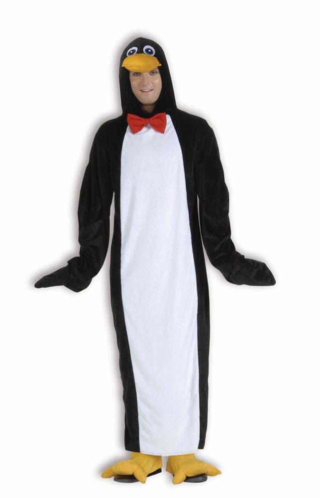 Плюшевый костюм пингвина представляет собой длинную тунику с капюшоном в виде мордочки пингвина. Белая грудка, черные крылышки, желтые лапки и красный галстук-бабочка на шее. Такой забавный и милый костюм можно надеть для маскарада или Новогодней вечеринки.