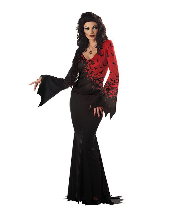 Платье Вампирши-Королевы Ночи - это длинное элегантное платье, выполненное в чёрно-красном цвете. Такой наряд будет хорошим выбором для Хэллоуина, маскарадов и карнавалов. Для завершения образа вы можете подобрать парик, грим и другие аксессуары.