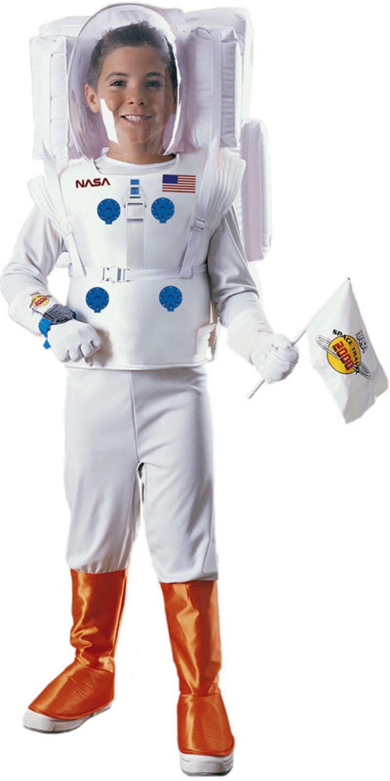 Так как к космосу, полетам, невесомости лучше привыкать с детства - вашему ребенку не обойтись без детского костюма космонавта, в который входят: комбинезон с накладками на обувь, жилет, надувной балон с кислородом, перчатки и флаг.