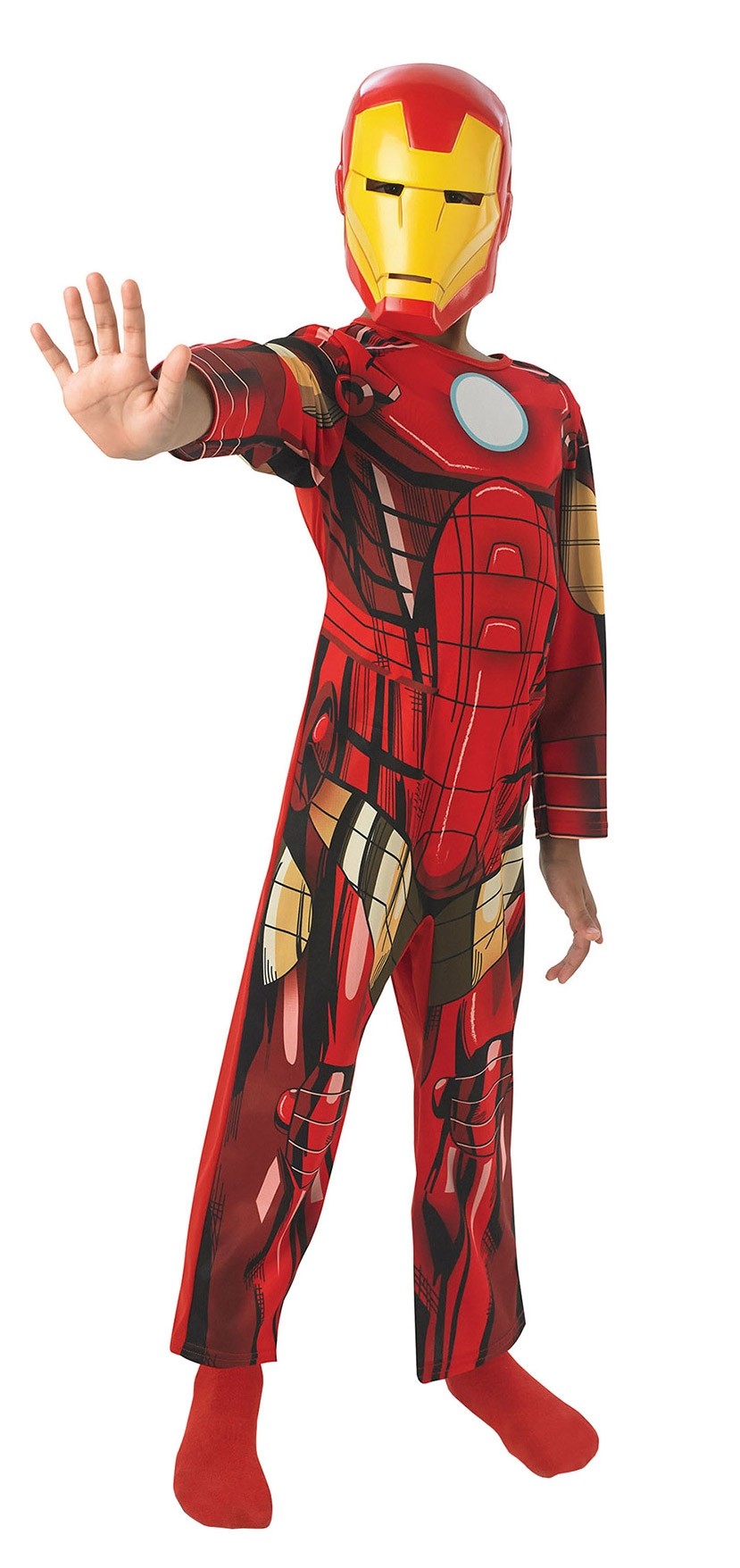 Костюм Железного Человека детский - образ одного из героев комиксов Marvel. В комплект костюма входит красный комбинезон с цветным и детальным принтом. К нему прилагается желто-красная пластиковая маска, имитирующая шлем костюма Железного Человека.