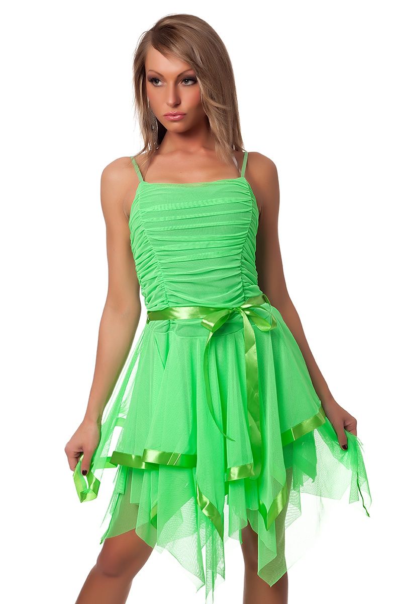 Легкое зеленое платье - это яркое свободное платье из шифона, которое может подойти для различных клубных вечеринок и других праздников. Платье на тонких бретельках со сборками на верхней части платья. Многослойная юбка с неровным асимметричным подолом с зеленой атласной ленточкой придает платью легкости и нежности. На поясе также имеется зеленая атласная ленточка с бантиком.