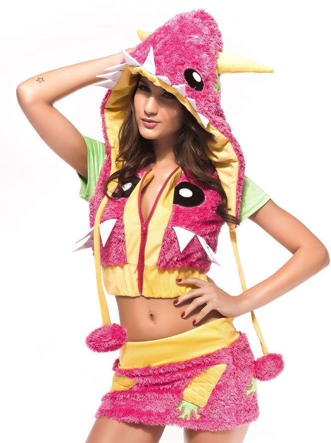 Розовый костюм монстрика выполнен из мягкого плюшевого материала. В комплект входит короткий топ с капюшоном, который имитирует мордочку милого монстирка, также имеется короткая юбочка с жёлтым поясом и украшенная морковками.