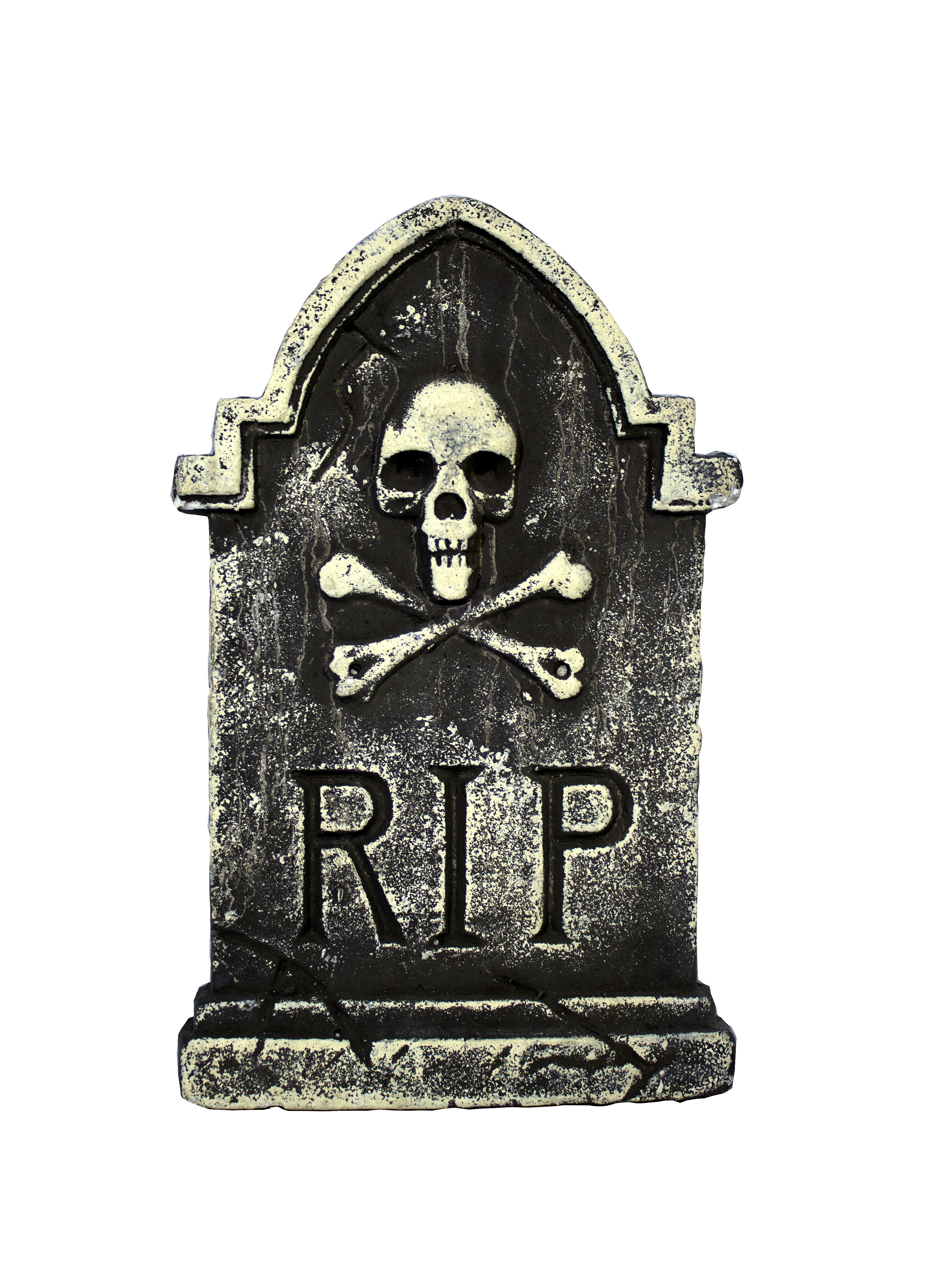Надгробие с черепом RIP 35 см - небольшая декорация, идеальная для Хэллоуина, выполненная в виде каменного надгробия с изображением черепа с костями и надписью RIP. Цвет декорации черно-желтый. Нижняя часть с небольшими трещинами.