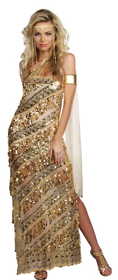 Костюм Золотой Богини включает в себя шикарное золотистое платье, украшенное бахромой и блёстками, золотистые нарукавные повязки,прозрачная накидка и изящный головной убор. Подберите к костюму туфельки и ваш образ готов. В этом наряде вы затмите кого угодно!
