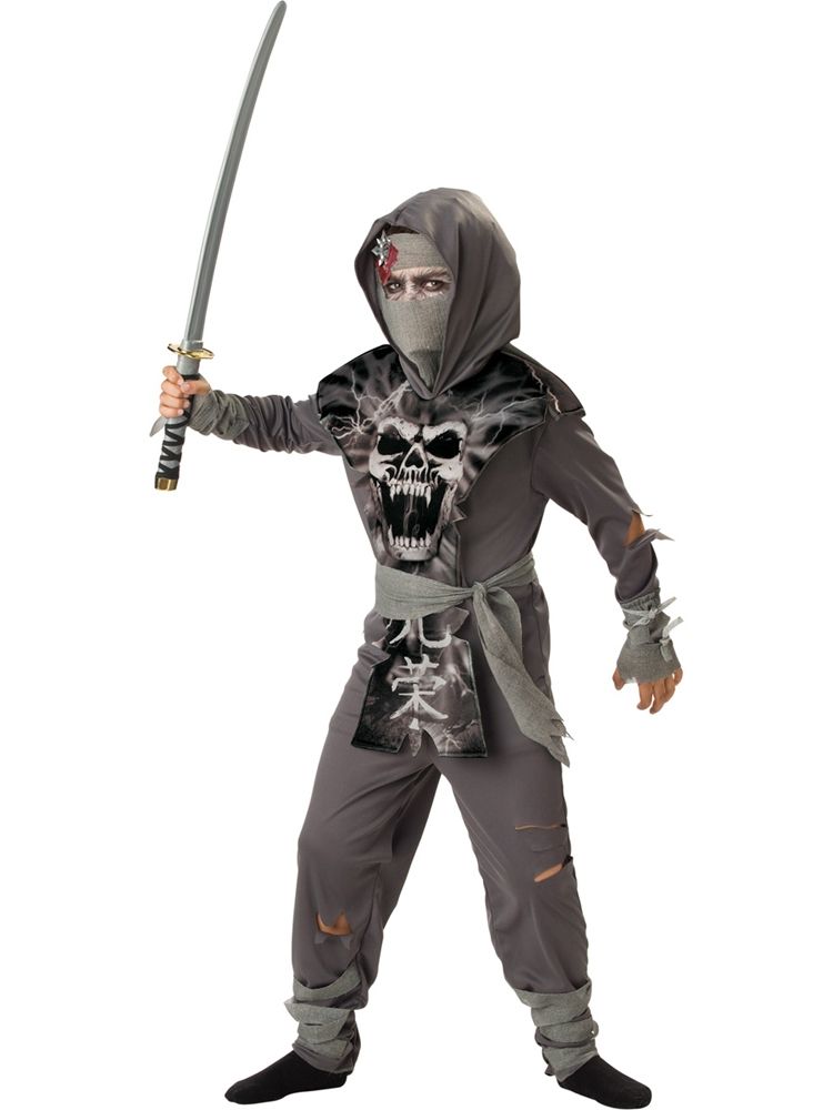 Детский костюм Ниндзя-зомби выполнен в серых тонах. В комплекте костюма имеется рубашка с капюшоном, накидка с изображением жуткого черепа, брюки, пояс, а также тряпичная маска на лицо и накладная аппликация, представляющая собой воткнутую звезду Ниндзя.
