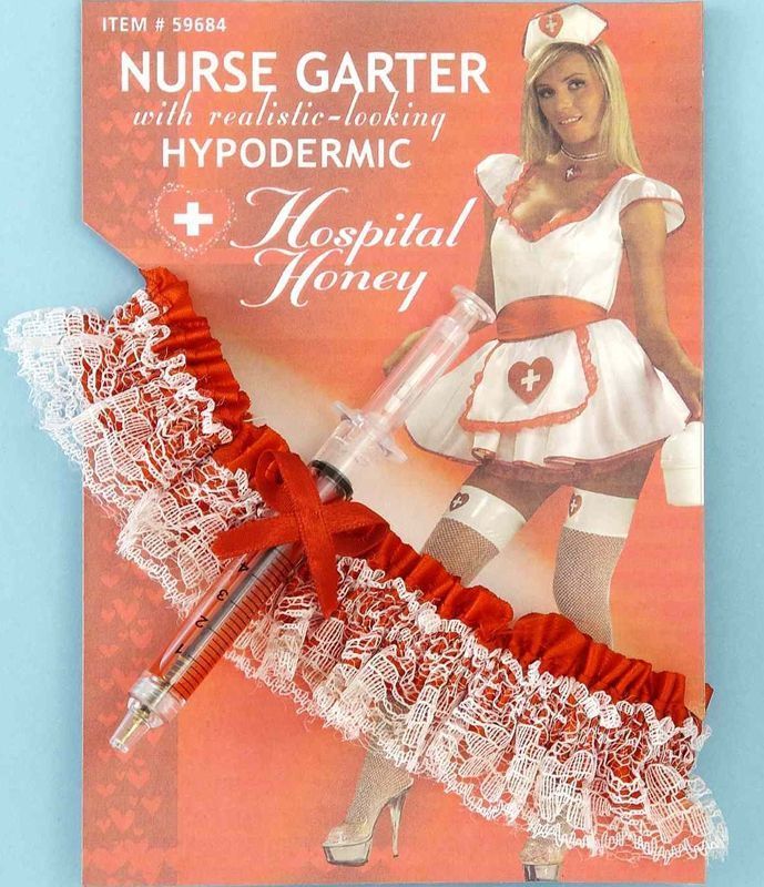 В комплекте имеется ажурная подвязка и шприц, наполненный красной жидкостью. Добавив к костюму медсестры этот набор и другие соответствующие аксессуары, чулки вы будете похожи на настоящую медсестру которая готова прийти на помощь.