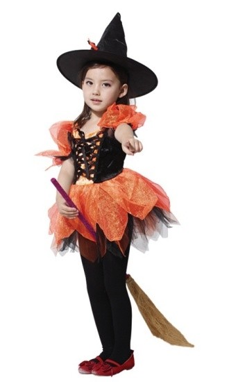Детский костюм чудесной ведьмы - беспроигрышный вариант наряда на Хэллоуин и другие костюмированные вечеринки. В комплекте черная конусная шляпа и очаровательное черно-оранжевое платье с пышной юбочкой, украшенное шнуровкой.