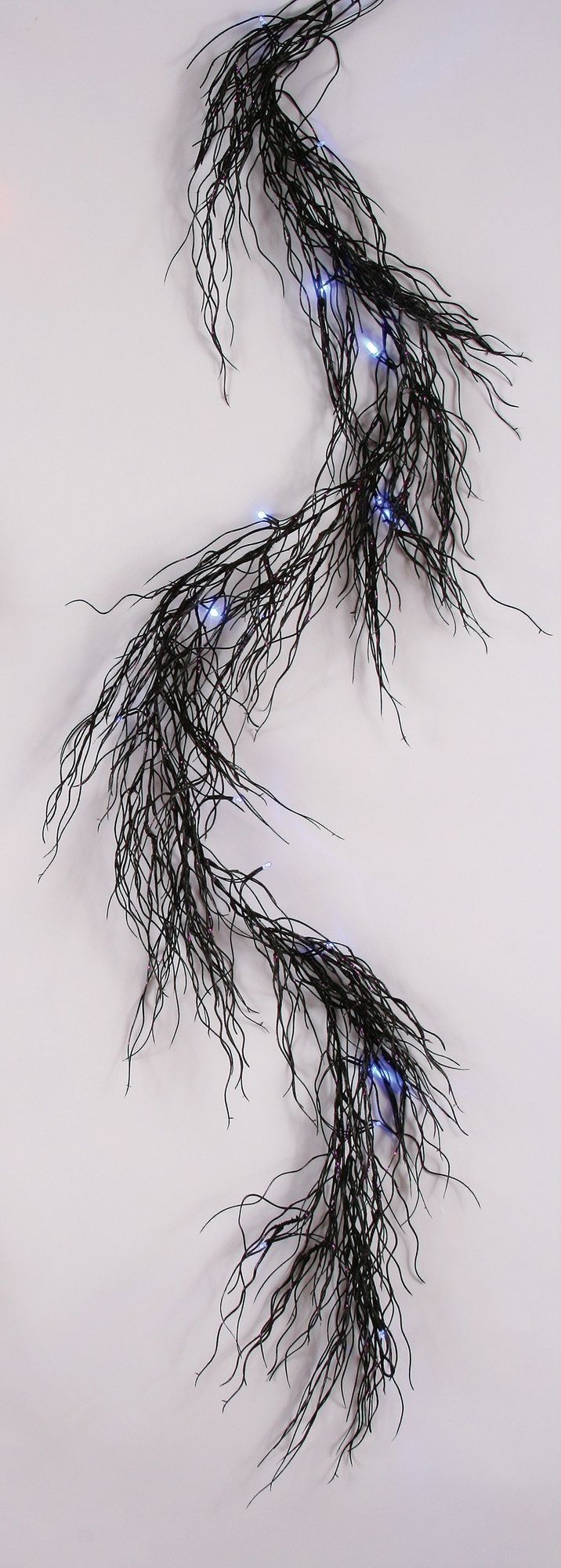 Светящаяся гирлянда черно-фиолетовая выполнена из тонких прутиков черного цвета, которые покрыты блестящим спреем. На гирлянде имеется 16 лампочек фиолетового цвета. Такая гирлянда подойдет в качестве украшения дома на Хэллоуин, Новый год и другие праздники. В комплект батарейки АА две штуки.