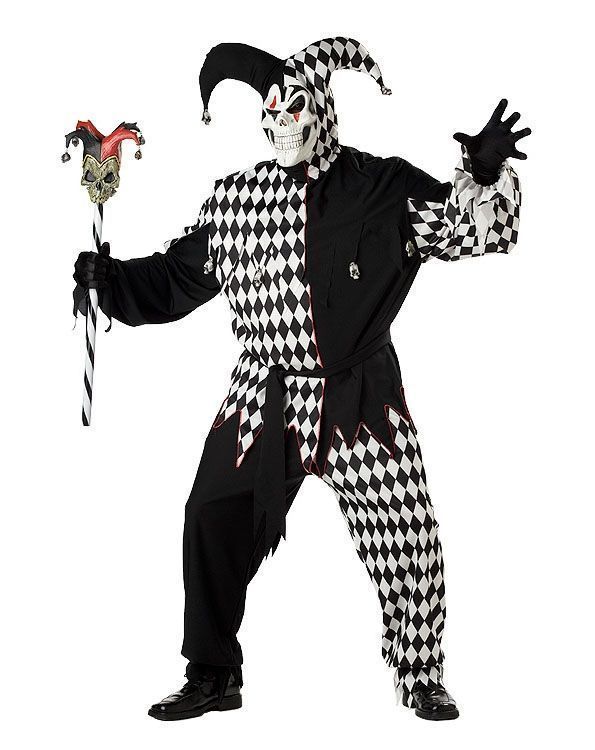 Черно-белый костюм злого шута включает в себя рубашку с прикрепленными черепами, брюки с подвязанными манжетами, черный пояс, головной убор с бубенцами и белую маску с жуткой улыбкой. Костюм сочетает в себе черный и белый цвета. Трость в комплект не входит. Этот шут не будет с вами шутить!