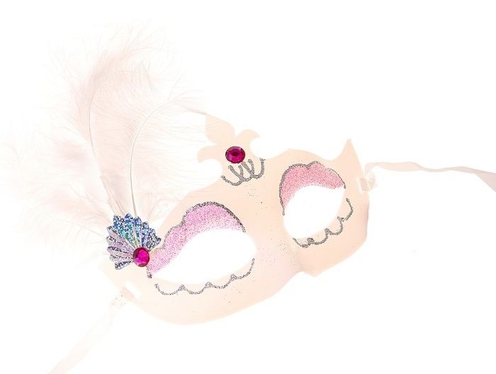 Карнавальная маска в белом цвете с розовыми вставками и с тремя перьями. Размер маски 18х10 см.