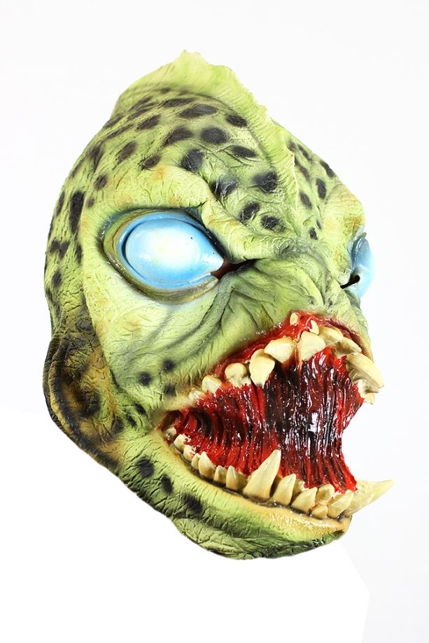 Маска ящера-рептилойда - латексная маска, выполненная в зеленом цвете и в черную точку. Маска с голубыми глазами и жуткой открытой пастью с острыми зубами.
