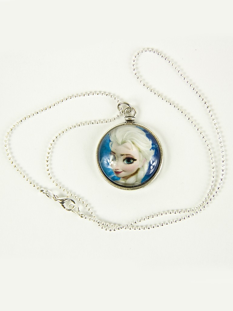 Новогодняя подвеска Эльзы из Холодного сердца украшена портретом Эльзы на синем фоне. Подвеска крепится к тонкой цепочке с маленьким карабином. С обратной стороны подвески имитация часов.