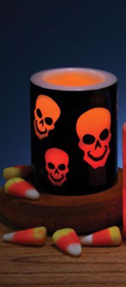 Светодиодная свеча с черепками выполнена в черном цвете, на ней изображены черепки. Свеча светится оранжевым светом. Идеальное украшение для дома на Хэллоуин.
