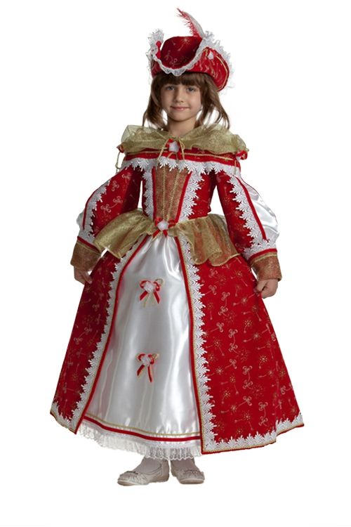 Детский карнавальный костюм позволит с лёгкостью перенестись в сказку. Шикарный образ обеспечивается с помощью роскошного королевского платья, состоящего из корсета и юбки с пышными подъюбниками . Юбка детского костюма красного и белого цветов, корсет – с длинными рукавами той же цветовой гаммы. По периметру платье расшито красными тесёмками, белым кружевом и маленькими розочками. Головной убор представляет собой шляпу с широкими полями, отделанную кружевом и украшенную длинным пером. Праздничный костюм позволит вашей девочке быть истинной королевой на детском утреннике, дне рождения, карнавале, костюмированном празднике.