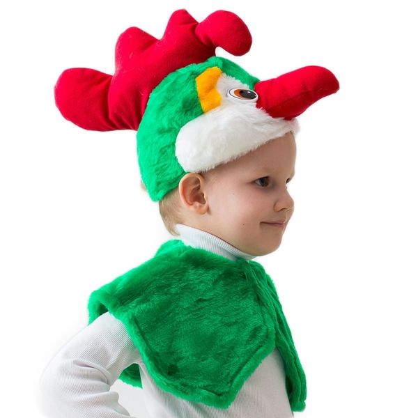 Комплект Петух эконом выполнен в ярком зеленом цвете. В него входит накидка на плечи на липучке, а также маска-шапка с клювом и красным гребешком.