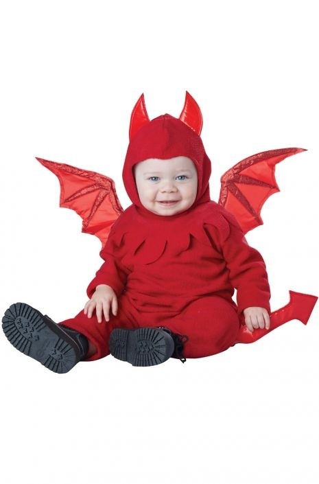 Костюм чертенка для малышей красного цвета представляет собой комбинезон с капюшоном, украшенным рожками, и съемные хвост и крылышки.