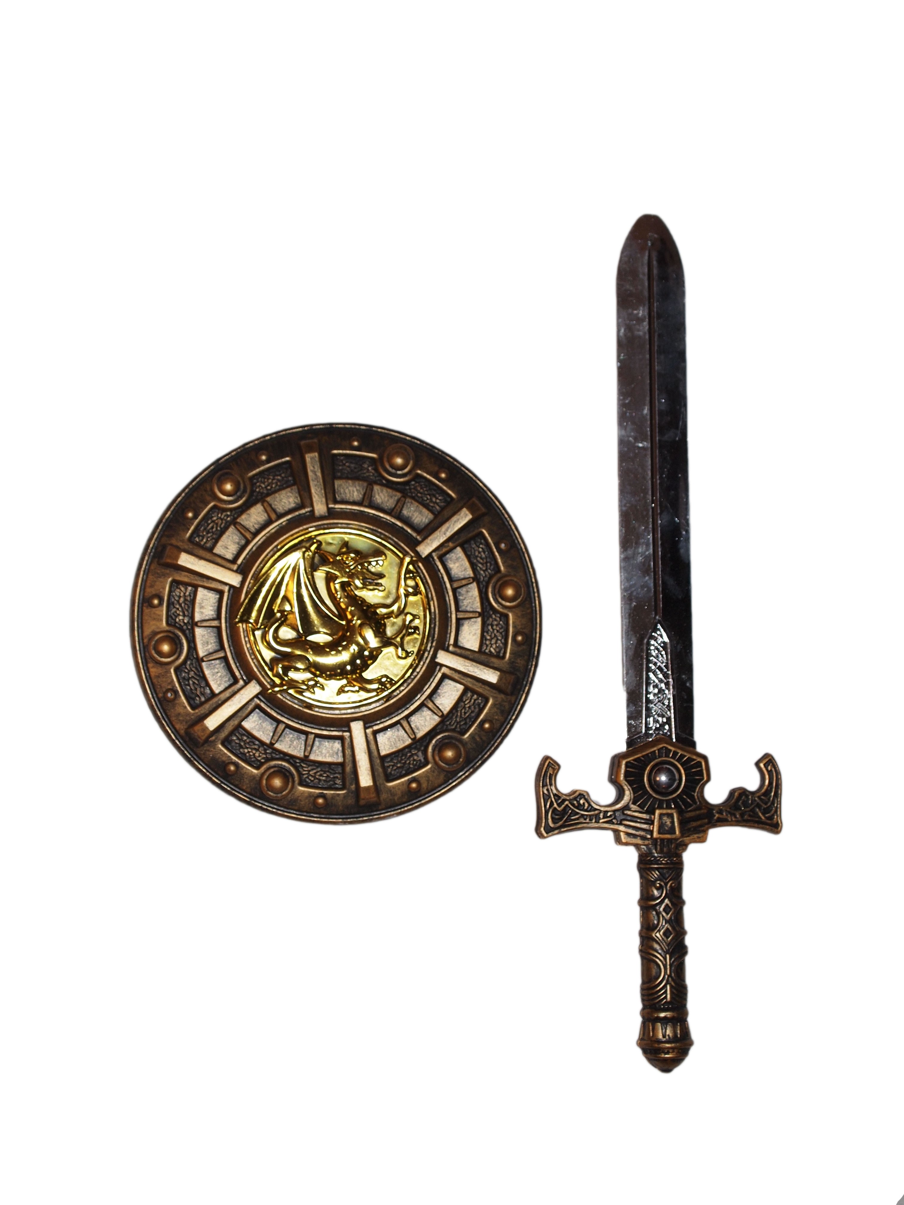 Карнавальный набор для богатырей включает в себя меч и щит. Набор выполнен из прочного пластикового материала золотистого и серого цветов.