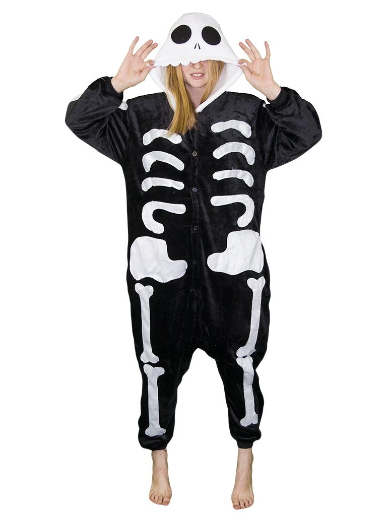 Пижама-кигуруми скелета выполнена в виде комбинезона с анатомическим принтом костей и капюшоном, который стилизован под череп. Ткань пижамы не даст замерзнуть даже самыми холодными ночами, а образ в целом несомненно привлечет к себе внимание на пижамных вечеринках или любом другом тематическом мероприятии.