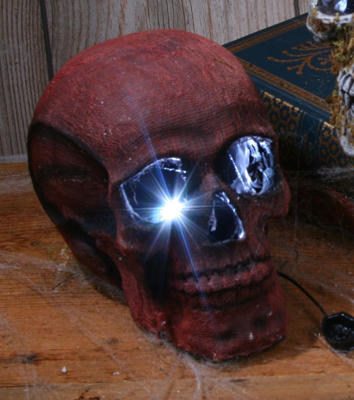 Светящийся страшный череп - это статуэтка, которая сможет украсить ваш дом на Хэллоуин. Череп обмотан в марлю и его глаза светятся. Дотронувшись до него происходит это свечение из глаз. В комплекте имеется три батарейки.