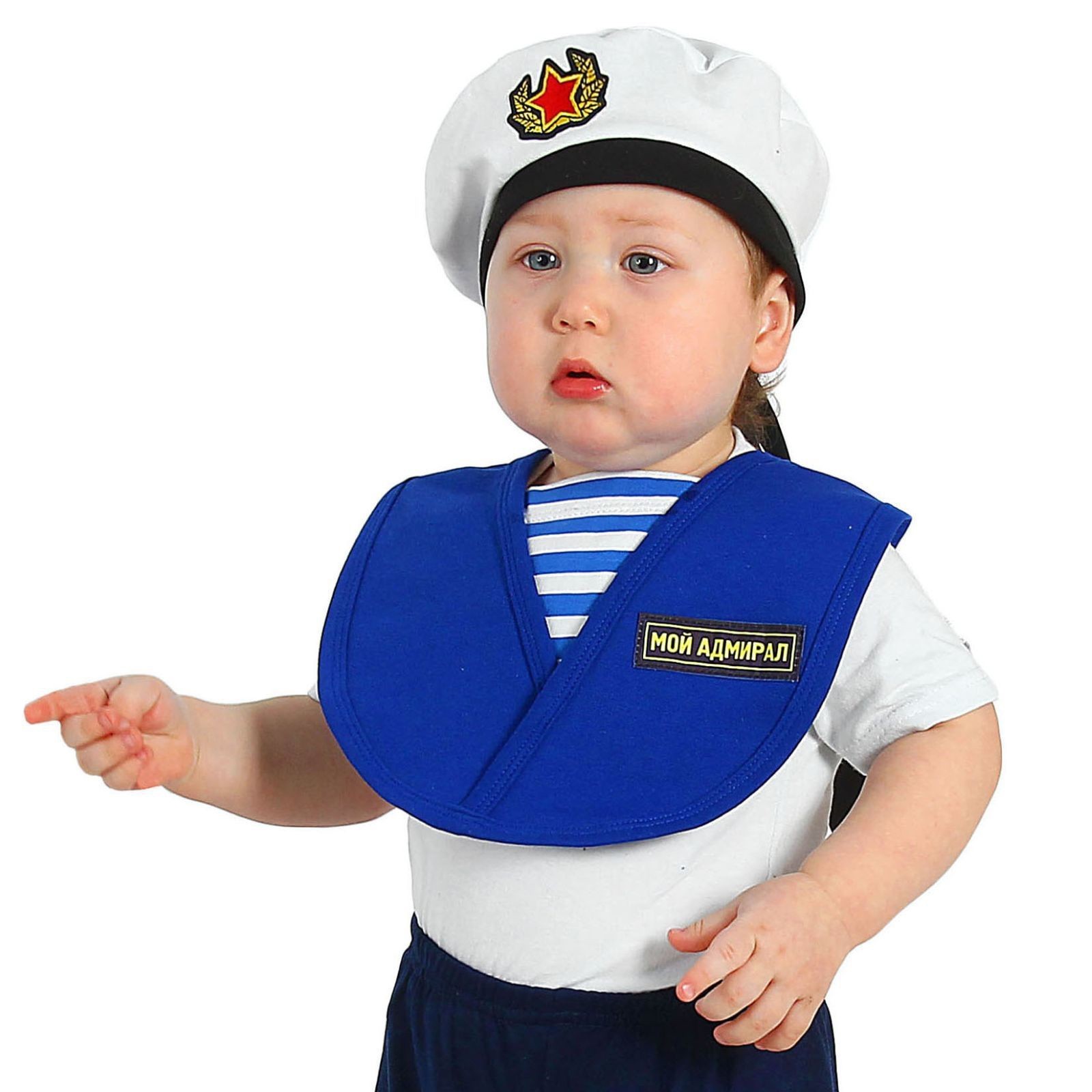 Набор для малыша Мой адмирал включает в себя синий нагрудник с полосатой вставкой и нашивкой сбоку. Также комплект дополняет белая бескозырка с нашивкой.